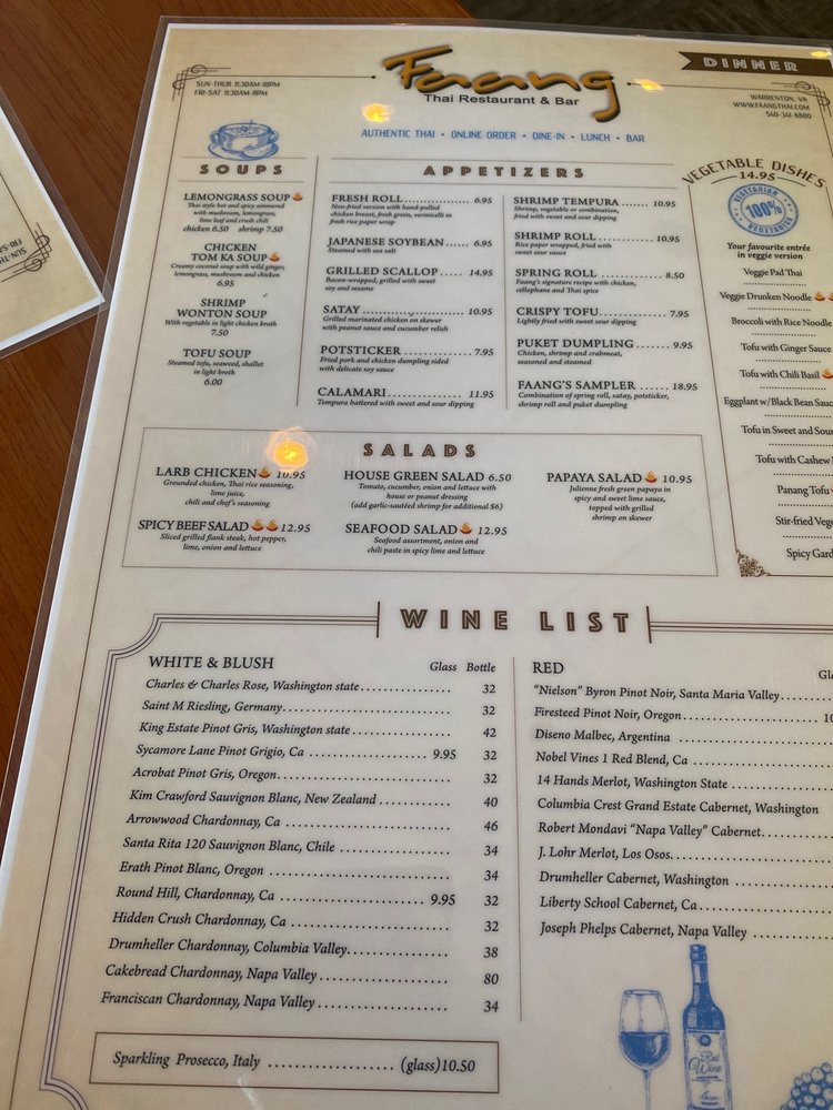 Located in Warrenton, VA, Faang Thai Restaurant & Bar offers a vibrant Thai dining experience. The menu features classic dishes like Pad Thai and Green Curry, as well as unique creations such as Bangkok Sunrise. Customers praise the flavorful dishes, generous portions, and friendly service. The restaurant's casual ambiance and full bar make it perfect for groups or a family night out. Outdoor seating, Wi-Fi, and even a pool table add to the relaxed atmosphere. Whether you're a Thai food enthusiast or a newbie, Faang Thai is sure to impress with its authentic flavors and inviting environment. With positive reviews highlighting the tasty food and welcoming staff, this spot is a must-visit for anyone craving delicious Thai cuisine.